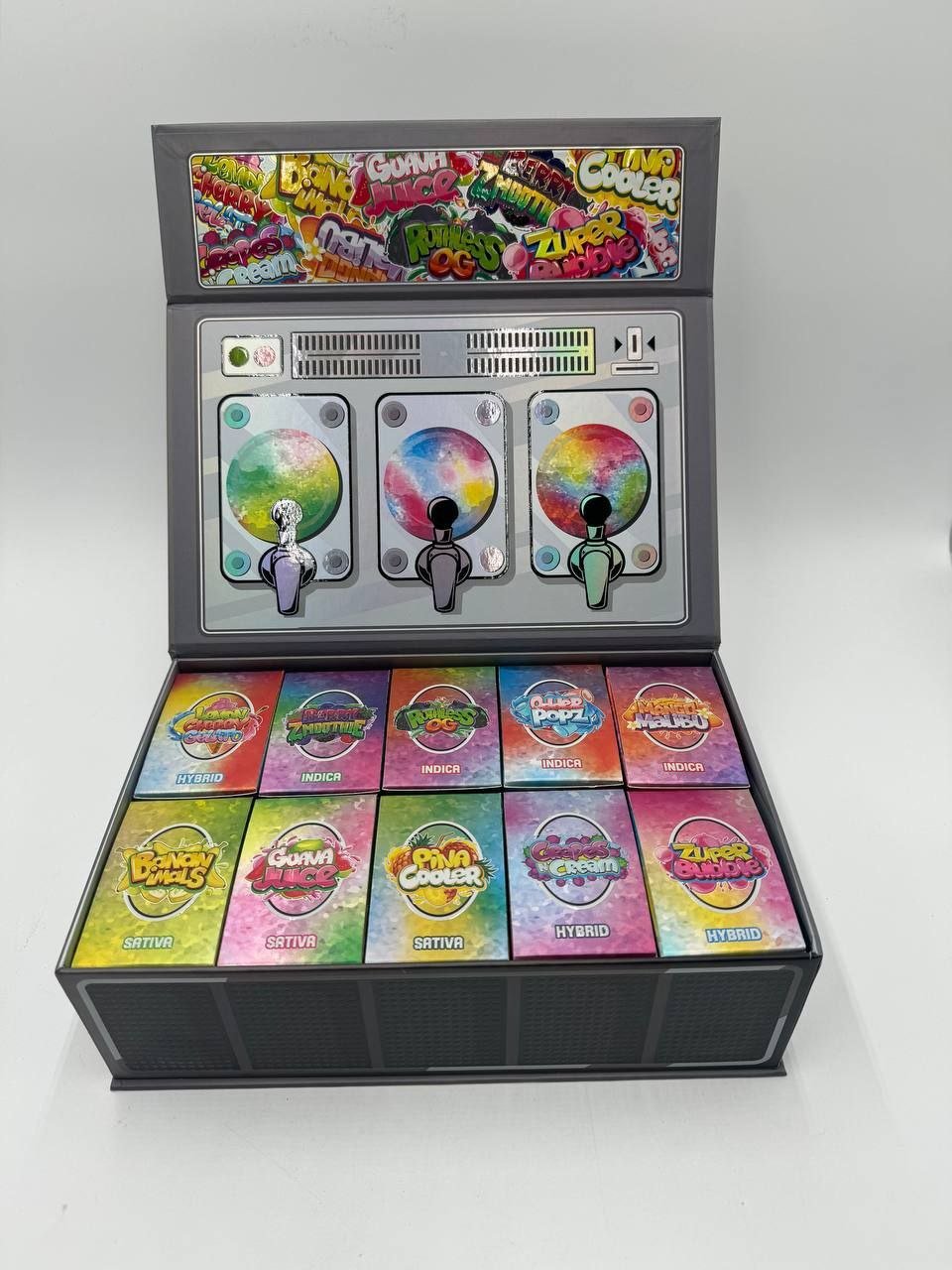 Lemon cherry gelato(Hybrid), Bananimals(Sativa), guava juice(sativa), berry zmootine(indica), pina cooler(sativa), ruthless OG(indica), grapes & cream(Hybrid), Zuper bubble(Hybrid), Mango malibu (indica), Popz(indica)