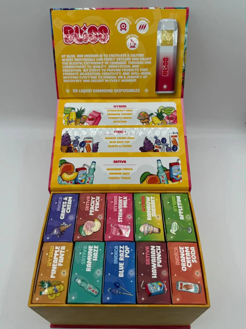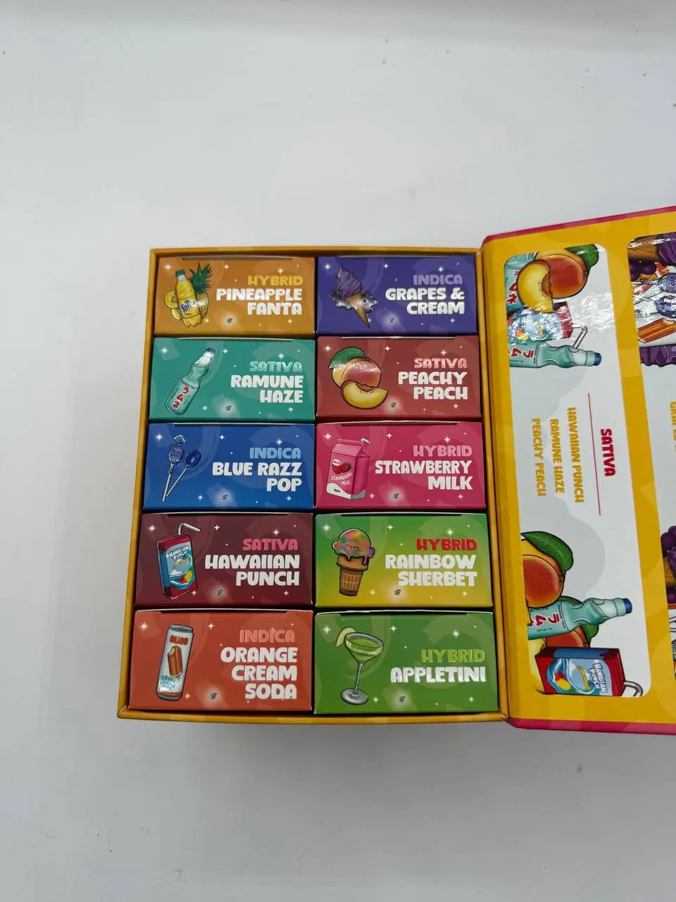 | Flavors | Appletini (Hybrid), Orange Cream Soda (Indica), Hawaiian Punch (Sativa), Raibow Sherbet (Hybrid), Strawberry Milk (Hybrid), Blue Razz Pop (Indica), Peachy Peach (Sativa), Ramune Haze (Sativa), Pineapple Fanta (Hybrid), Grapes & Cream (Indica) |