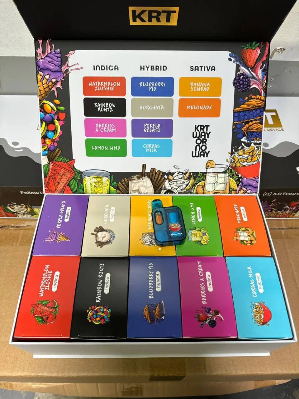 | Flavors | Watermelon Zlushie (Indica), Rainbow Runtz (Indica), Berries & Cream (Indica), Lemon Lime (Indica), Blueberry Pie (Hybrid), Horchata (Hybrid), Purple Gelato (Hybrid), Cereal Milk (Hybrid), Banana Sundae (Sativa), Melonade (Sativa) |