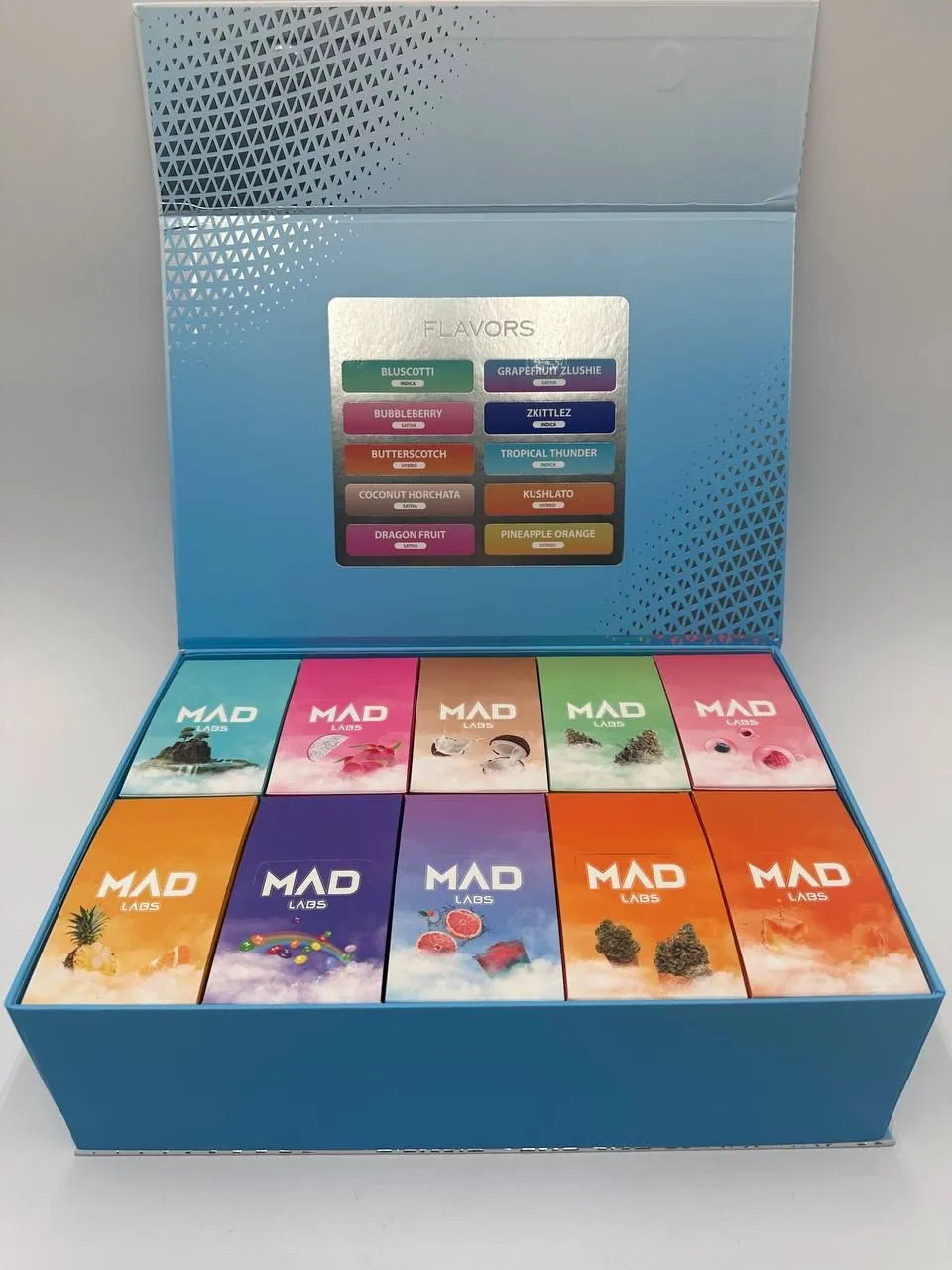 Bluscotti (Indica), Bubbleberry (Sativa), Butterscotch (Hybrid), Coconut Horchata (Sativa), Dragon Fruit (Sativa), Grapefruit Zlushie (Sativa), Zkittlez (Indica), Tropical Thunder (Indica), Kushlato (Hybrid), Pineapple Orange (Hybrid)